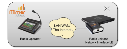 The Mimer SoftRadio system consists of software that runs on Windows PC´s. The software works together with one or more Network Interfaces that are connected to two-way radio units. One Network Interface is needed for each radio unit.