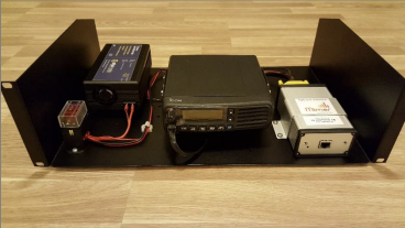Icom radio installed on the open rack shelf