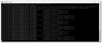 Example of the log being displayed in PuTTY as two clients talk with the default configuration